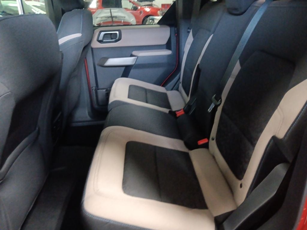 The Bronco's stunning exterior in Red Metallic Tinted Clearcoat is complemented by the Carbonized Gray Molded-In-Color Hard Top, providing a unique and rugged look. The Black Roof Rails with Crossbars add to the Bronco's adventurous spirit, allowing you to carry all your gear with ease.