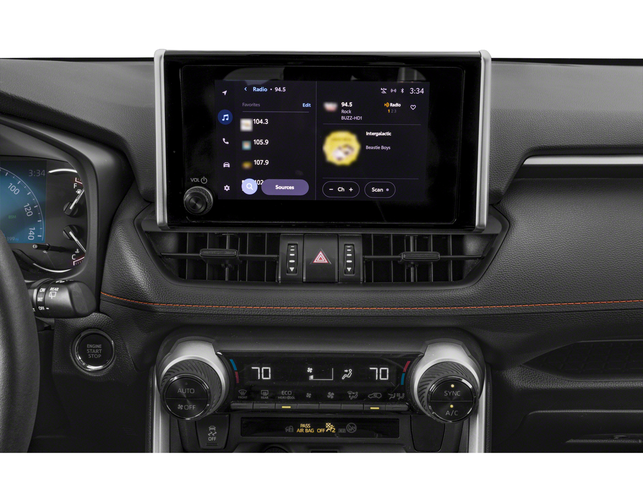 The RAV4 Adventure's interior is a harmonious blend of style and functionality. Indulge in the refined SofTex seat trim, which offers exceptional comfort and support, while the leather-wrapped steering wheel and shift knob add a touch of sophistication. Stay connected with the intuitive infotainment system, featuring Apple CarPlay, ensuring seamless integration with your digital life.